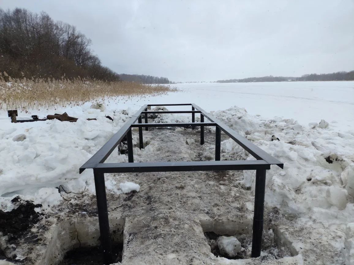 Процесс монтажа начался с точной разметки ледяного зеркала под габариты будущего объекта. Общая длина пирса составила 8 метров при ширине 2 метра. Каждое технологическое отверстие во льду подготавливалось с учетом проектных осей. Погружение 5 метровых стальных опор производилось на расчетную глубину, пока каждая свая не достигла необходимого крутящего момента, подтверждающего ее несущую способность.