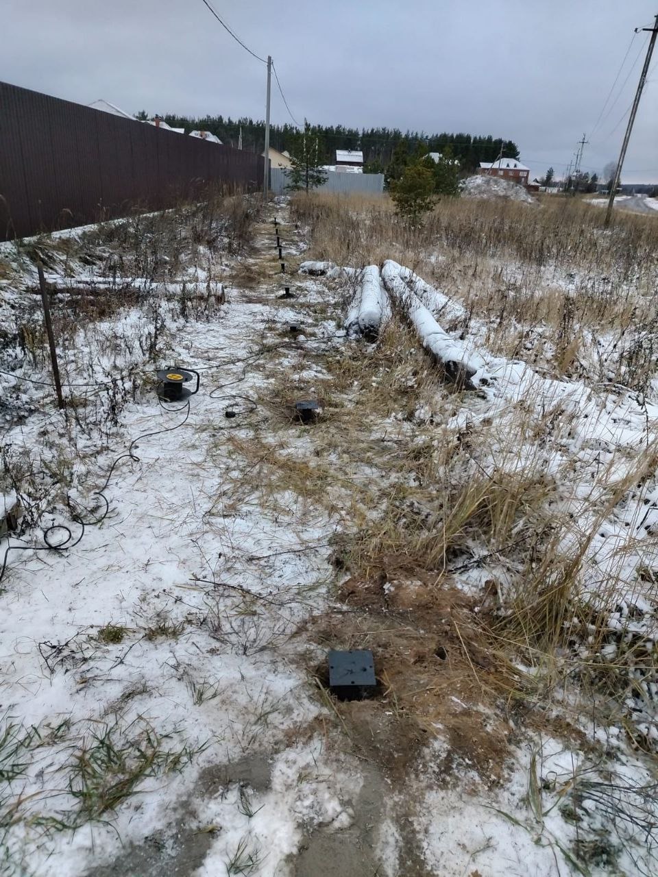 3. Установка оголовков: После установки свай, на каждую из них был закреплен оголовок, который обеспечит надежную опору для столбов забора. Это важный этап, так как от точности и качества крепления зависит прочность и долговечность конструкции.
